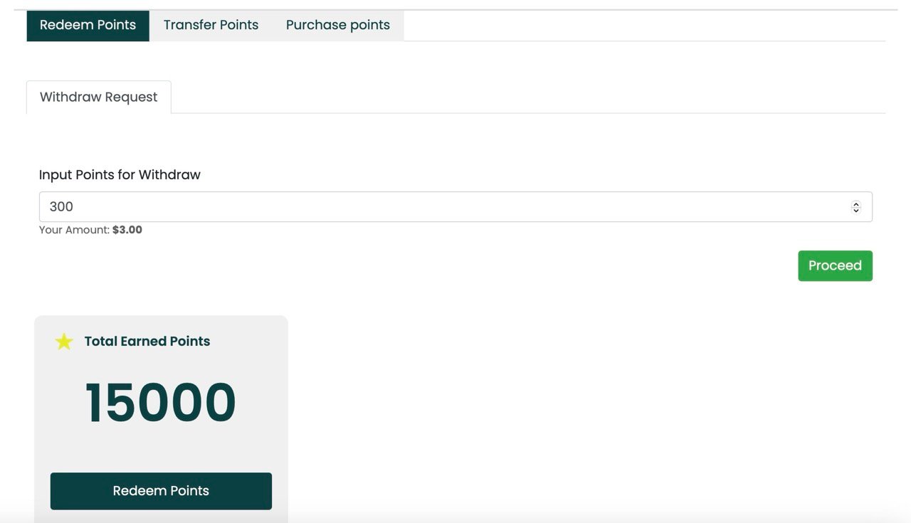 Select the redeem points button, enter the amount of points to withdraw, and enter. You must have a default payment method for this to work